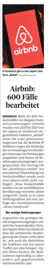 Illegale touristische Kurzzeitvermietungen belasten den Innsbrucker Wohnungsmarkt nach Aussagen der Stadtregierung weiterhin. Kurzzeitvermietungen sind oft deutlich profitabler als klassische Vermietungen – gleichzeitig entziehen sie dem Wohnungsmarkt wertvollen Wohnraum und tragen dazu bei, dass Mieten weiter steigen. Für viele Innsbruckerinnen und Innsbrucker wird leistbares Wohnen dadurch zunehmend schwieriger. Die Stadt Innsbruck hat bereits 2021 eine eigene Taskforce gegen illegale Kurzzeitvermietungen eingerichtet. Gemeinderätin Mag.a Christine Oppitz-Plörer hat diese Initiative von Beginn an begrüßt und unter dem Vorsitz von GR Marcella Duftner als Mitglied vollinhaltlich unterstützt.