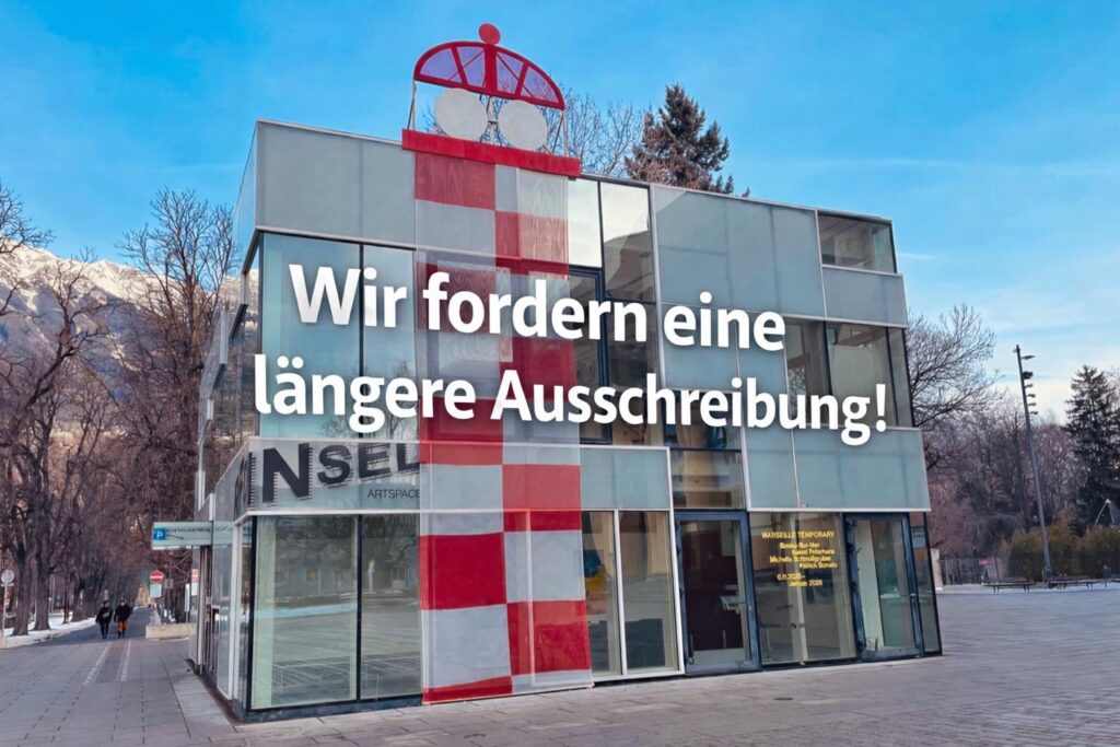 Die battlegroup for art, ein Zusammenschluss zentraler Innsbrucker Kultur- und Interessenvertretungen, schlägt Alarm: Medienberichten zufolge soll der etablierte Kunstort „Reich für die Insel Artspace“ im Kubus am Rennweg verdrängt und die Fläche ohne öffentliche Ausschreibung an einen Gastronomen vergeben werden. Für Das Neue Innsbruck kritisiert die battlegroup zurecht das Fehlen klarer Kriterien und schließt sich […]