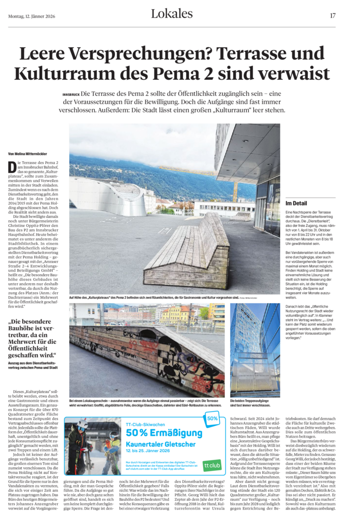 Die Räume sind da. Die Verträge sind da. Die Chance ist da. Was fehlt, ist konsequente Verantwortung und aktives Management durch jene, die seit 2018 zuständig sind. Immerhin hat Georg Willi – der seit 2018 entweder als Bürgermeister oder jetzt als Kulturreferent zuständig war bzw. ist – angekündigt „Druck zu machen“. Die Hoffnung stirbt zuletzt…