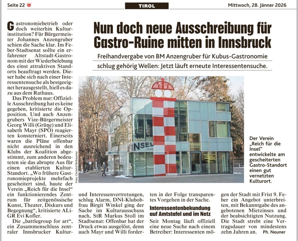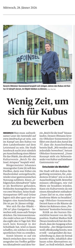 „Besonders problematisch ist, dass jene Akteurinnen und Akteure, die nicht bereits seit Monaten mit konkreten Planungen befasst sind, faktisch ausgeschlossen werden. Gerade beim Kubus – einem sensiblen Ort an der Schnittstelle von Kultur, öffentlichem Raum und Stadtentwicklung – braucht es ein sauberes, faires und zeitlich realistisch gestaltetes Verfahren. Alles andere beschädigt nicht nur das Vertrauen in politische Entscheidungen, sondern auch die Glaubwürdigkeit des Anspruchs auf Transparenz. Wir fordern daher eine Ausweitung des Verfahrens um weitere vier Wochen“, so Stoll abschließend.