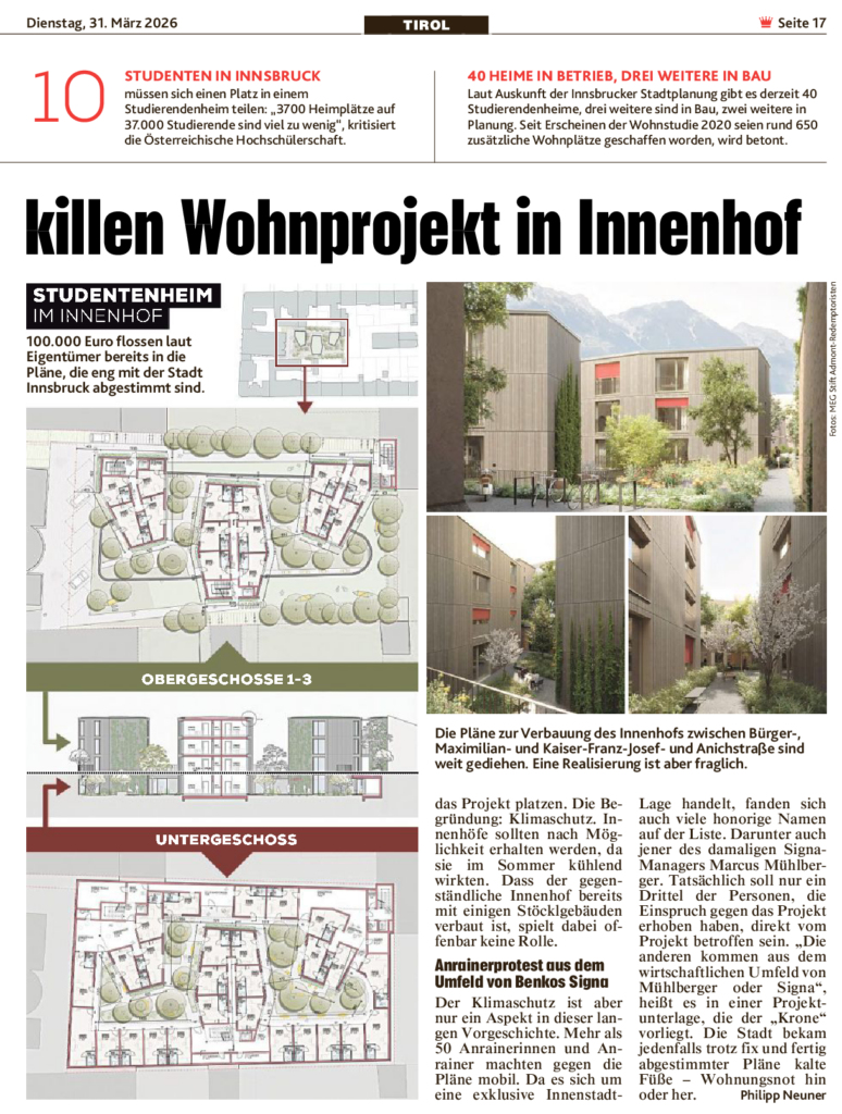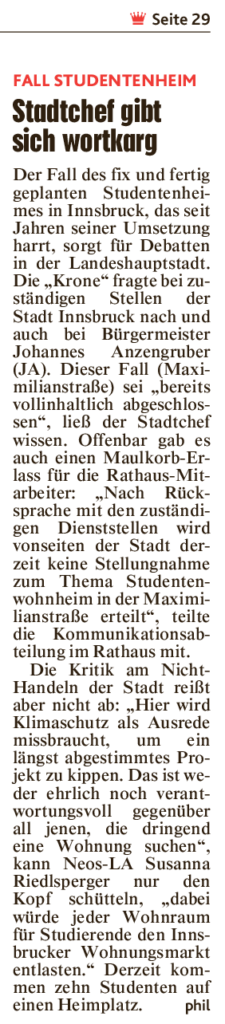 Was sich in der Maximilianstraße abzeichnet, ist ein politischer Offenbarungseid der linken Stadtregierung. Ein über Jahre entwickeltes, mit der Stadt abgestimmtes und durch zahlreiche Zwischenschritte abgesichertes Projekt wird plötzlich gestoppt – obwohl es zuvor jahrelang mitgetragen wurde. Die Leidtragenden sind viele: das Stift Admont ebenso wie Studierende und Familien, die dringend leistbaren Wohnraum suchen. Gerade Studierendenheime tragen dazu bei, den privaten Wohnungsmarkt zu entlasten.